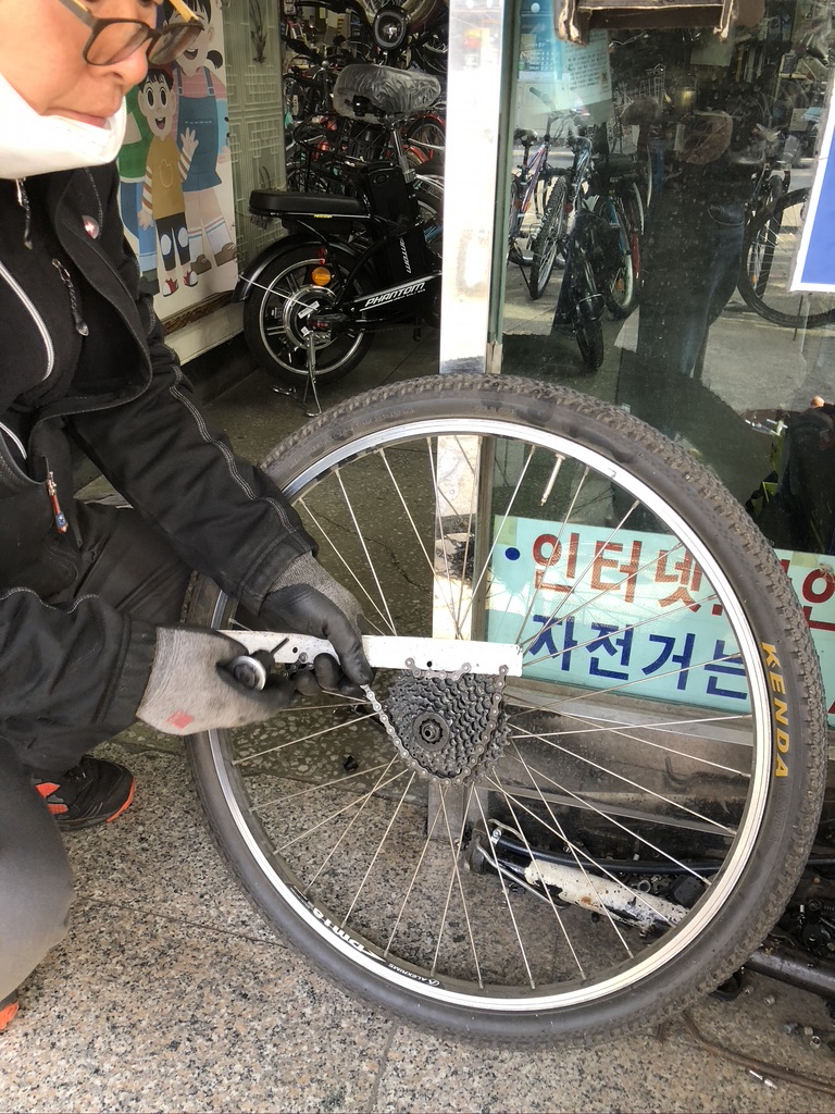 다음으로 뒷바퀴를 분리해 보았습니다. 뒷바퀴를 분리하는 것은 기어 톱니가 있어서 별도의 장비가 필요한 작업이었습니다. 뒷바퀴에 달린 기어 톱니를 청소하고 다시 조립했습니다.