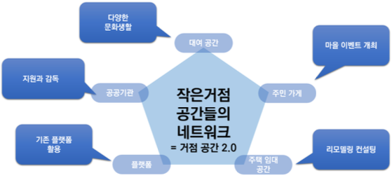 ● 기존의 도시재생과 마을만들기에서 중요한 부분이었던 ‘거점공간’은 한 곳에 집중되고, 비수익형이며, 공공기관이 주도한다는 특징이 있었다. 우리가 제시하는 ‘거점공간2.0’은 분산형(네트워크형), 수익형, 주민 주도라는 특성을 갖는다.