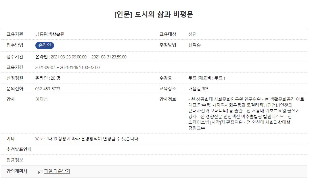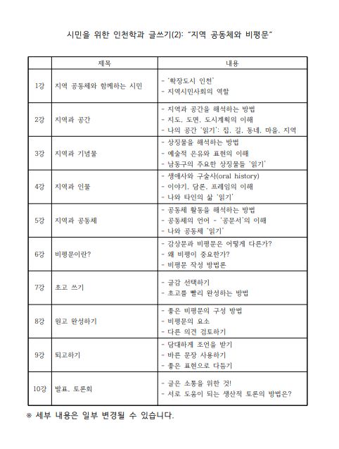 남동구 평생학습관 하반기 강좌 "도시의 삶과 비평문"