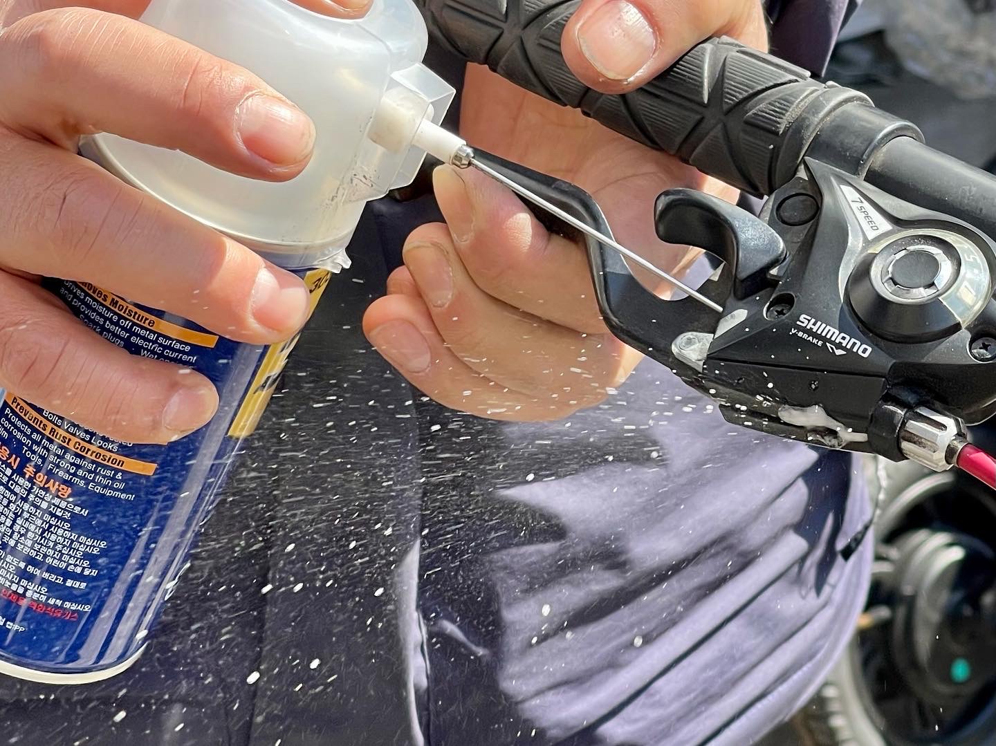 겨우내 잠자던 자전거를 꺼내어 녹슬기 쉬운 브레이크선이나 연결부위에 방청제를 발랐습니다.